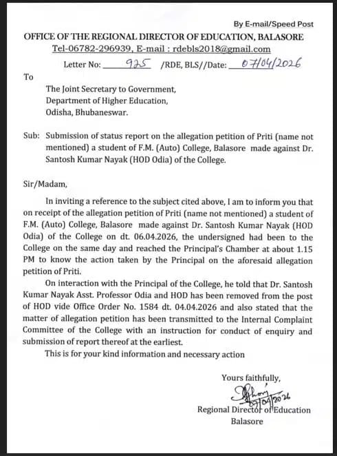 ବାଲେଶ୍ୱରର ଆଞ୍ଚଳିକ ଶିକ୍ଷା ନିର୍ଦ୍ଦେଶକଙ୍କ କାର୍ଯ୍ୟାଳୟରୁ ଏପ୍ରିଲ 7, 2026 ରେ ଏକ ସରକାରୀ ଚିଠି ଅନୁଯାୟୀ, ଡକ୍ଟର ନାୟକଙ୍କୁ ଏପ୍ରିଲ 6 ରେ ତାଙ୍କ HOD ଦାୟିତ୍ୱରୁ ମୁକ୍ତ କରାଯାଇଥିଲା। ଏହି ପଦକ୍ଷେପର ଲକ୍ଷ୍ୟ ହେଉଛି ଏହି ମାମଲାର “ନିରପେକ୍ଷ ତଦନ୍ତ” କରିବା।